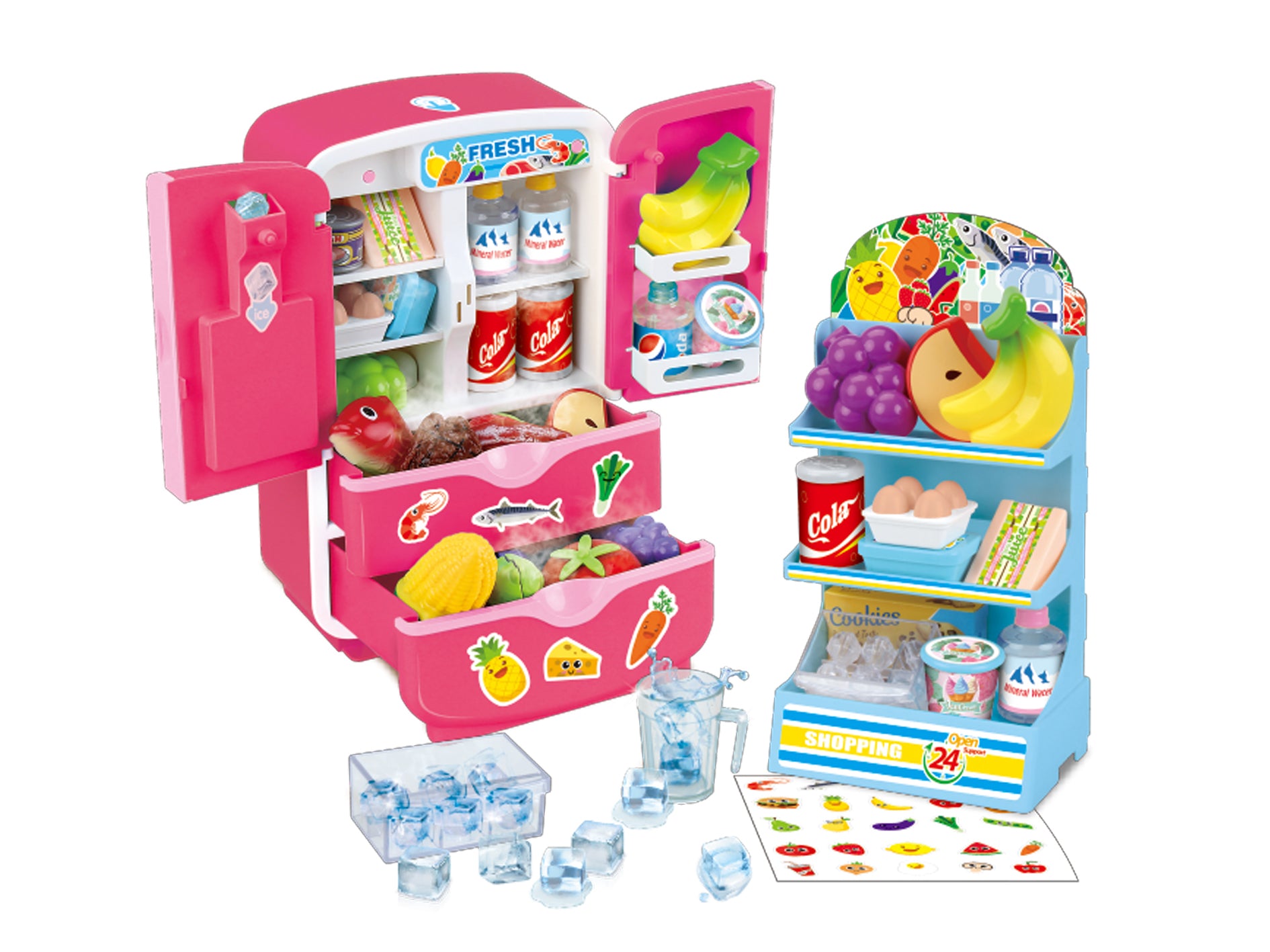 Cool down playtime with a realistic and colorful play fridge! This adorable, durable refrigerator playset is packed with realistic features and play food items, offering a fun way for children to engage in imaginative role-playing, grocery shopping, and healthy eating habits.