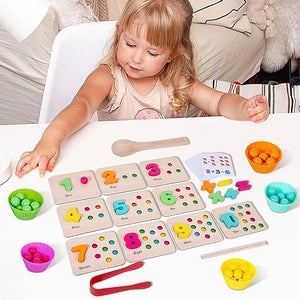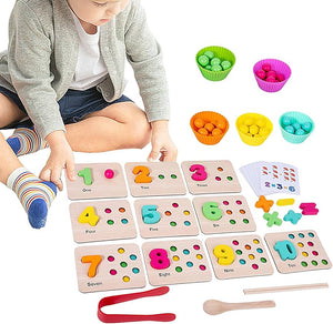 Wooden board with colorful beads and lidded shape compartments. Uses a magnetic stylus to pick up beads and match to numbers 1–10. Great for hand–eye coordination, color recognition, and early arithmetic .